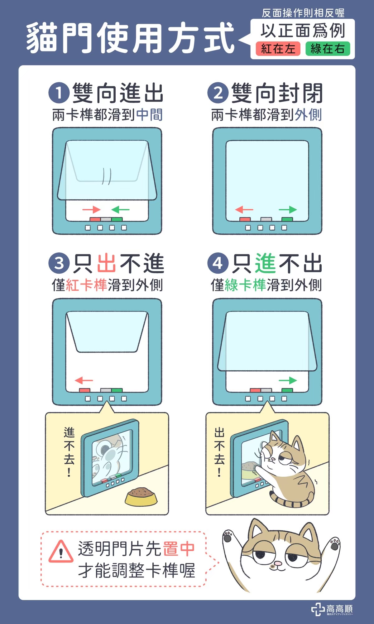 - 貓🐱門:透過兩顆按鈕可調整四種進出模式,提供貓咪更多自由。