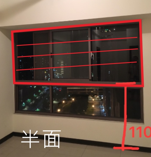 半面式隱形鐵窗只保護上半部可以移動的玻璃,下半部的固定玻璃不做,這樣可以省下下方不做的費用,因為下方玻璃是不會移動的,因此除非固定玻璃破掉,否則不影響安全性。依照理論來說,現在的玻璃安全性是足夠的,同時這也是最多人安裝的方案。窗戶半面式隱形鐵窗都是要做成橫式的,因為直式的做出來就變成全面的或局部的。窗戶半面式隱形鐵窗如果是左右方向有一大片固定玻璃的話,沒有腳路時也是無法安裝的。