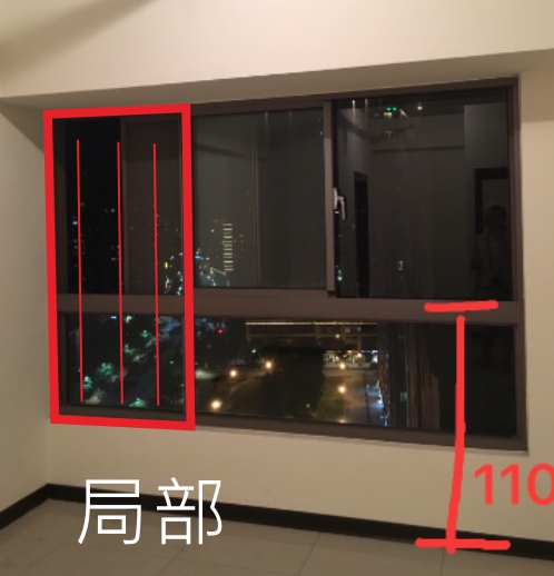 局部式隱形鐵窗只保護左半部或右半部可以移動的玻璃區域,其他固定玻璃的部位不做,在有開關位置的部位安裝隱形鐵窗,可以最低預算搭建防墜保護網。這也是影響視野最少的安裝方式。窗戶局部式隱形鐵窗通常都是要做成直式的。如果下方固定玻璃高度太高的話,可以將下方鋁框固定在窗框,算是沒有腳路時的折衷方法。